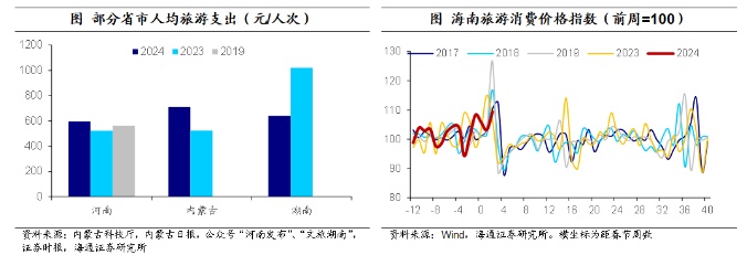 各省市旅游景区营业情况红火,接待游客人次、营业收入相较2019年和去年同期都有明显增长。在有数据的省市中,接待游客数量相较去年和2019年的同比增速,其中位数分别为57.4%和50.2%,营业收入则分别为97.3%和42.7%。其中,增速最高的为内蒙古自治区,根据内蒙古文旅厅数据显示,春节假期前五天,全区接待游客数量和旅游收入分别为2023年的6.29倍和8.52倍。北京、江西、湖南、湖北、山东等省市景区接待游客数量均较2023年增长50%以上;山东、河南旅游收入也较2023年增长50%以上。