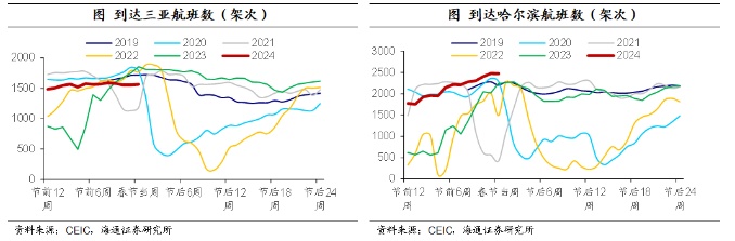 城市内部交通较往年更为活跃。市内交通方面,今年春节假期的地铁客运量高于近年同期水平,拥堵延时指数与往年基本持平。不过从相较于2019年,地铁客运和拥堵指数的同比增速在节前和假期基本持平。这说明虽然今年春节城市内交通较往年相对活跃,但这主要是由于整体市内交通状况的改善,春节的影响相对较小。