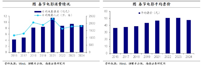 电影消费方面量增价减,低线级城市观影人群的占比提升。正月初一至初五,日均观影人次为2286.3万人,较去年和2019年分别增长4.3%和2.3%;日均电影票房为11.4亿元,较去年减少1.1%,较2019年增长13.7%。值得注意的是,今年电影的平均票价进一步降低,重回50元/人次以下,较去年降价5.2%。
