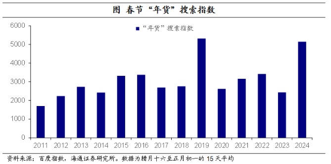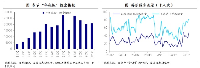商品消费方面,整体居民消费需求有所回升。根据新华网、新华社援引商务部数据显示,1月18日至2月6日年货节期间,网络零售额接近8000亿元,比去年农历同期增长8.9%,实现2024年网络消费“开门红”。中国商业联合会数据显示,2月份中国零售业景气指数为51.2%,较上月上升0.3个百分点。购买年货是春节期间的主要消费,我们整理了春节前期(腊月十六至正月初一)关键词“年货”的百度搜索指数,可以发现今年居民对年货的需求量明显高于往年,仅次于2019年。