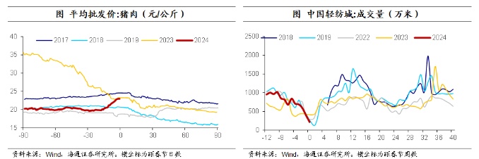 从具体品类来看,非耐用品中食品饮料需求增加。受聚餐、宴请等需求增加影响,节前主要食品均在涨价,且涨价幅度快于季节性,各主要食品价格均在边际回升。其中前期表现低迷的猪价回升明显,当前绝对值为近年同期较高位;蔬菜价格则升至近年同期最高位。根据商务部公布的数据,重点监测零售企业绿色有机食品销售额同比增长10%以上。不过在非耐用品中,纺织服装消费相对偏弱,春节当周轻纺城成交量连续第五周小幅回落,但相较于2019年农历同期的同比跌幅持续收窄,当前绝对值仍处于农历同期偏低位。