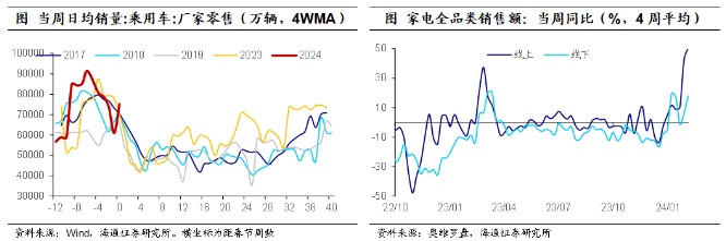 汽车和家电等耐用品消费也有不错表现。节前一周乘用车批发和零售消费的当周绝对值大幅回升,四周平均销售明显回升,与2018和2019年趋势一致但速度更快。相较于往年农历同期,上周汽车零售、批发消费均处于农历同期最高位。这或是由于春节临近汽车消费需求集中释放。节前一周家电线上单周销额销量同比增速大幅回落,线下单周销额同比增速小幅回落而销量同比增速由负转正,考虑基数变化,线上线下销售额均边际回升,这主要是由于在各项促进家电消费政策下,随着春节临近家电消费逐渐升温。