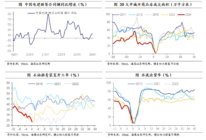 基建方面,资金相对充裕,项目量边际增加。1月金融机构新增企业中长期贷款回升至自2023年1月以来的最大值,与历年趋势一致,仅低于2023年同期,或反映当前资金量充裕。1月中国电建新签合同额同比增幅扩大,当前项目量在边际回升。