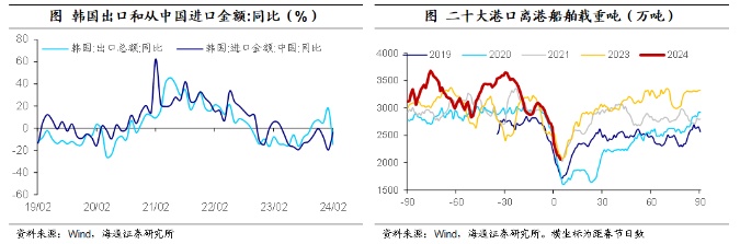 韩国出口和进口数据受春节错位影响较大。2月前10天韩国从中国进口和出口同比增速分别为-3.4%和-14.6%(1月整月为-19.5%和18.0%),韩国从中国进口在边际回升而出口在边际回落,这部分是由于春节错位对数据的影响。从港口数据来看,春节期间港口运行放慢,但好于往年。节前一周以来,我国港口停靠的出入境船舶数量、二十大港口到港离港船舶数和载重吨数均季节性回落,与历年趋势一致,不过从绝对值来看,今年港口的船舶流量、货物运送数量均处于近年同期较高位。从运价来看,国内外运价均在回升。国际方面,节前一周和春节长假期间国际海运运价(BDI)持续小幅回升,两周的周环比增速分别为5.8%和5.9%。节前一周国内进口运价连续第六周小幅回升。