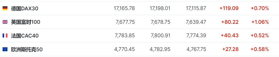 2. 欧股方面,截至发稿,德国DAX指数涨0.70%,英国富时100指数涨1.06%,法国CAC40指数涨0.52%,欧洲斯托克50指数涨0.58%。