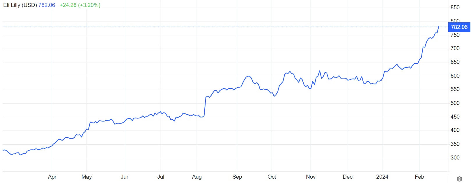 智通财经APP获悉,在“减肥神药”Zepbound强势催化之下,美国医药巨头礼来(LLY.US)股价屡创新高之势促使华尔街大行摩根士丹利(Morgan Stanley)的分析师们思考,该医药巨头会否成为“美股七大科技巨头”(Magnificent Seven)之外第一家市值达到1万亿美元的美国医药公司。2023年礼来股价涨幅超60%,自2024年以来礼来股价不断创新高,涨幅已高达35%,截至周五收盘股价为782.06美元。