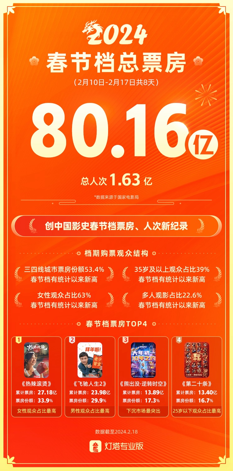 过年看片、追剧已成为新年俗。2月18日,阿里大文娱发布一组数据显示,2024年春节档娱乐消费呈现出“线上线下双增长”现象。据灯塔专业版,春节档电影总票房80.16亿,观影人次1.63亿,均刷新中国影史春节档纪录。由阿里影业(01060)参与出品、发行的《热辣滚烫》拿下票房冠军,也是档期内女性观众占比最高的作品。而线上电影春节档也迎来丰收,优酷电影频道大屏端用户时长同比去年春节档增幅近30%。