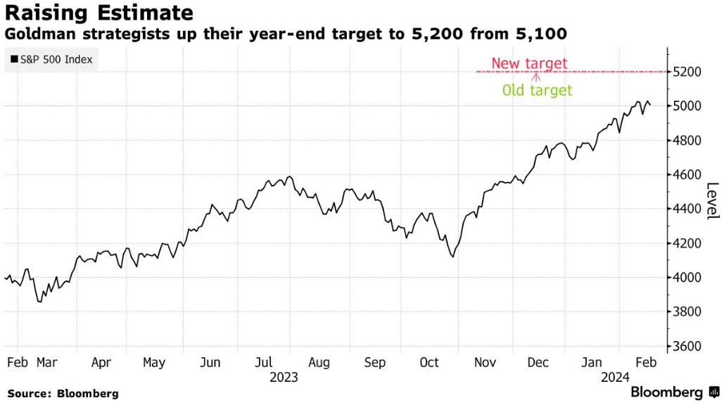 高盛2024年标普500指数的目标价为5,200点,目前是华尔街最高的目标之一,加入了包括Fundstrat Global Advisors的Tom Lee和Oppenheimer Asset Management首席策略师John Stoltzfus在内的华尔街多头行列,他们的年底目标价都相似。