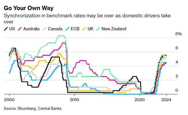Bloomberg Economics经济学家James McIntyre表示:“通胀放缓和经济增长降温增强了人们对货币政策制定者今年将转向和放松政策的预期。虽然各国在抗击通胀方面团结一致,但随着形势的转变,异常情况是不可避免的。个别国家的情况将在转向降息的过程中发挥更大的作用,至少在最初阶段是这样。以新西兰为例,新西兰央行关注当前高移民带来的潜在通胀冲击,这加剧了利率可能在一段时间内走高的风险。”