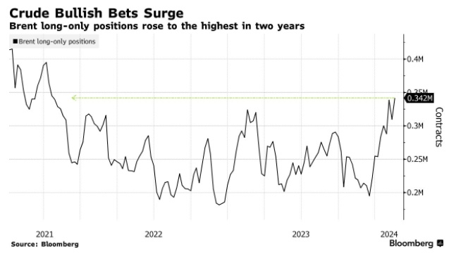 作为全球约三分之一原油的来源,中东地区的地缘政治风险不断加剧支撑着油价,全球基准布伦特原油的看涨押注目前已经达到2021年以来的最高水平。