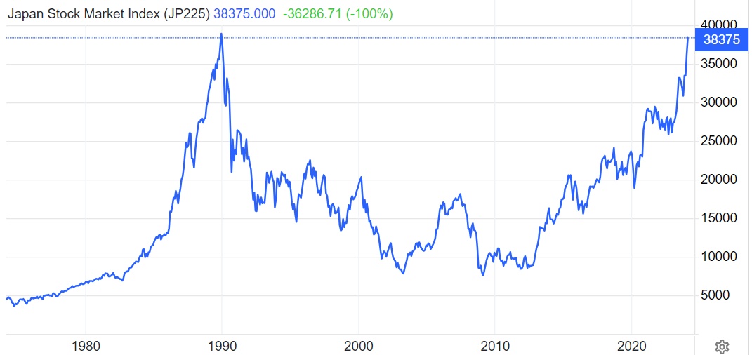 继去年疯狂上涨28%之后,日本股市基准股指之一——覆盖众多低估值蓝筹股的日经225指数今年迄今可谓屡创新高,迄今已上涨15%,接近前不久创下的1989年以来的历史高点——38865点。日经 225指数历史最高点为1989年,即平成元年日本泡沫破裂时期创下的38957点。