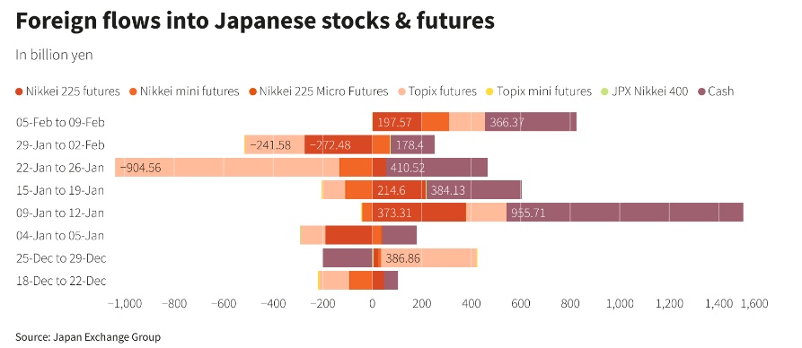 东京证券交易所的上述统计数据显示,截至2月9日当周,外国投资者们净买入日本当地股票的规模达到大约8174.3亿日元(大约 54.4 亿美元),这是自1月12 日以来日本股市最大规模的单周净买入水平。
