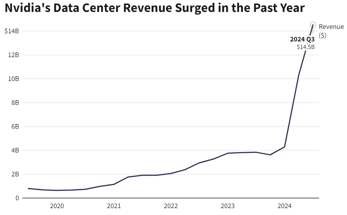 去年11月,英伟达公布的第三季度收益飙升,超过预期,这得益于该公司提供云和人工智能服务的数据中心业务的增长。第三季度,数据中心部门的收入达到了145.1亿美元的历史新高。