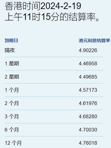 智通财经APP获悉,2月19日,港元拆息维持涨跌不一。隔夜拆息较上周五急升逾71基点,报4.90226%,创超过1星期新高,连升2个交易日;与楼按相关的1个月拆息维持于4.57173%;至于1星期、2星期、2个月、3个月及6个月拆息都轻微下跌,分别报4.46958%、4.49685%、4.61976%、4.6828%及4.7003%,而1年期拆息升至4.76018%。