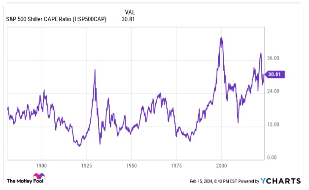 换言之,标普500指数的席勒市盈率有着完美的记录,即如果该指标超过30倍,基准指数将至少下跌20%。2023年11月至今,截至2024年2月15日收盘,席勒市盈率为33.85倍。
