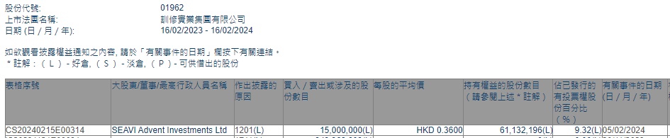 智通财经APP获悉,香港联交所最新资料显示,2月5日,SEAVI Advent Investments Ltd减持训修实业(01962)1500万股,每股作价0.36港元,总金额约为540万港元。减持后最新持股数目约为6113.22万股,最新持股比例为9.32%。