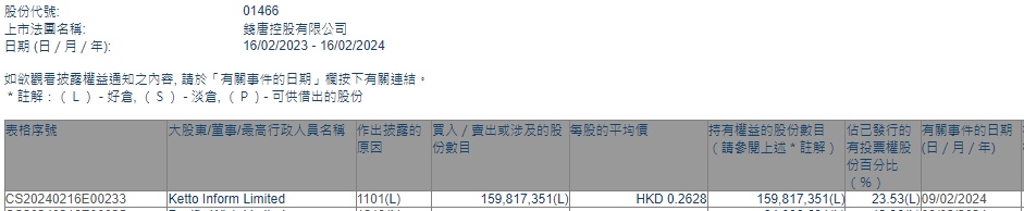 智通财经APP获悉,香港联交所最新资料显示,2月9日,Ketto Inform Limited增持钱唐控股(01466)1.59817351亿股,每股作价0.2628港元,总金额约为4200.00万港元。增持后最新持股数目约为1.60亿股,最新持股比例为23.53%。