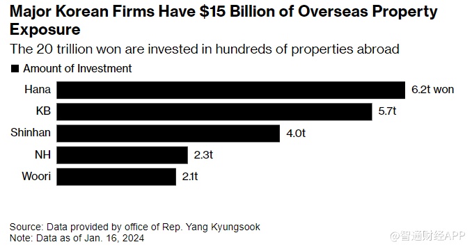 智通财经APP获悉,韩国反对党一名议员表示,韩国五大金融公司的20万亿韩元海外房地产投资面临约1万亿韩元(7.49亿美元)损失,反映出人们对该行业受全球估值下跌影响的担忧日益加剧。根据韩国民主党议员Yang Kyung-sook的数据,韩亚金融集团的海外房地产投资规模最大,超过6.2万亿韩元。KB金融集团的投资额为5.7万亿韩元,新韩金融集团的投资额为4万亿韩元。友利金融集团和农协金融集团也跻身海外房地产投资额前五名。Yang的数据基于这些公司在1月中旬提供的信息。