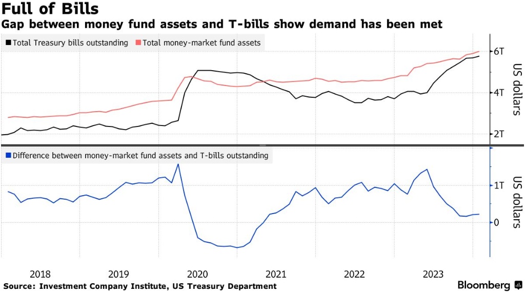 因此,去年有超过1万亿美元流入货币基金,是ICI自2007年以来记录最多的一年。这些资金流入帮助货币基金跟上了美国国债发行的步伐,货币市场总资产与未偿还国债之间的差距虽然在缩小,但仍表明市场对短期国债有兴趣。