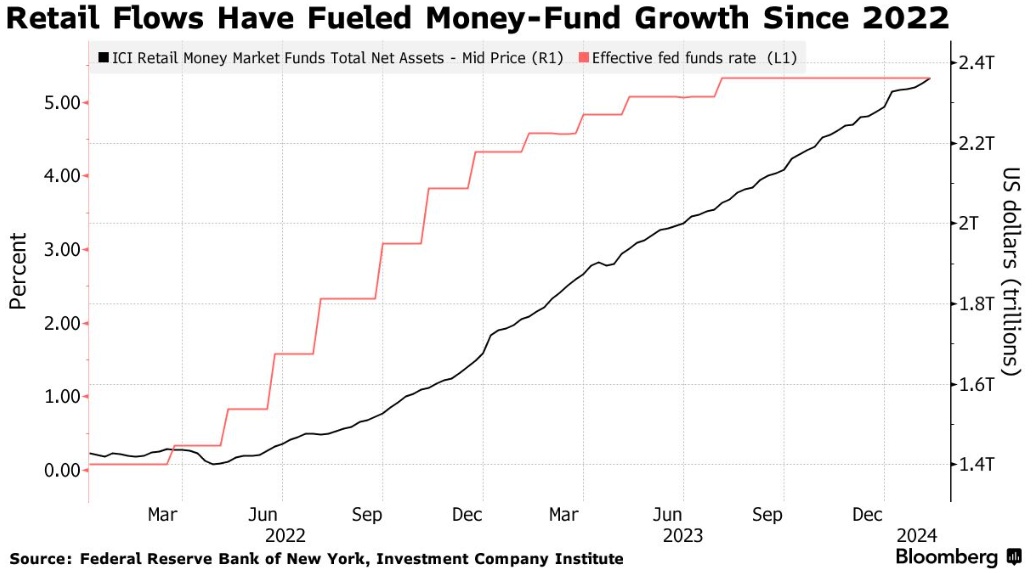2022年,美联储启动了几十年来最激进的加息步伐,将利率推高至远高于5%的水平,从资产管理公司到家庭投资者,所有人都注意到货币市场基金、美国国债和其他短期资产的吸引力,而银行存款的收益几乎为零。