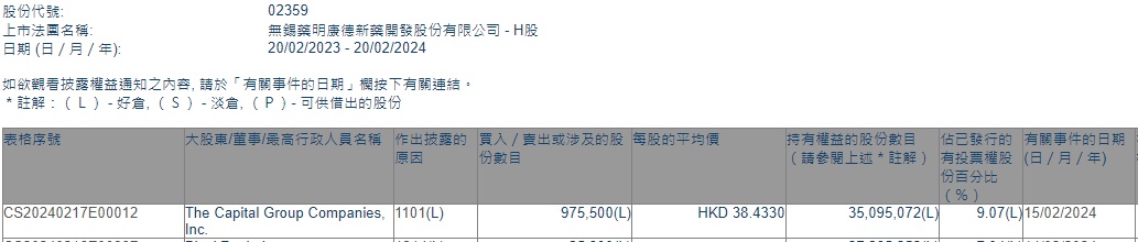 智通财经APP获悉,香港联交所最新资料显示,2月15日,美国资本集团增持药明康德(02359)97.55万股,每股作价38.4330港元,总金额约为3749.14万港元。增持后最新持股数目约为3509.51万股,最新持股比例为9.07%。