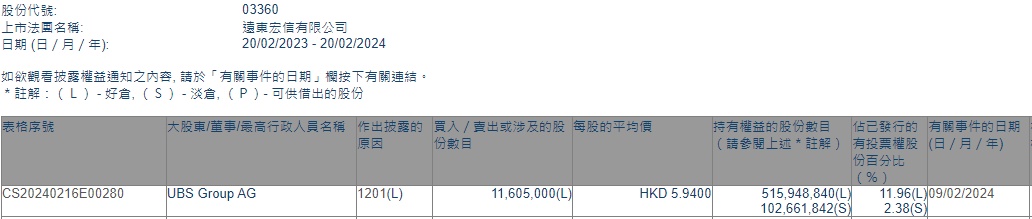 智通财经APP获悉,香港联交所最新资料显示,2月9日,瑞银(UBS Group AG)减持远东宏信(03360)1160.5万股,每股作价5.94港元,总金额约为6893.37万港元。减持后最新持股数目约为5.16亿股,最新持股比例为11.96%。