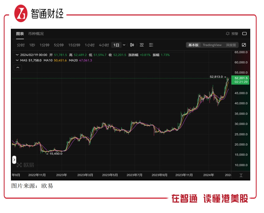 智通财经APP了解到,近期加密货币行情火热,其中比特币最为抢眼,该币从2022年11月底低位(约1.54万美元一枚)一路上涨并接近原来的高度,于今年2月15日突破5.2万美元,涨幅高达238%,而在比特币带动下,以太币及比特黄金等多个主流币趋势性翻倍。