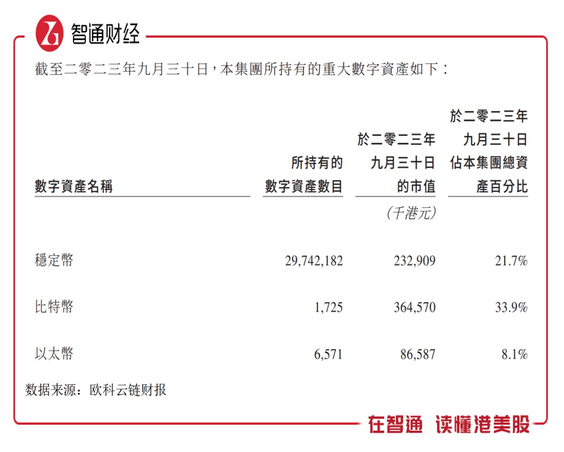 值得一提的是,在持币的概念股中,欧科云链胆子是最肥的,因为“重仓”了数字货币。该公司主要从事地基、楼宇建筑工程及配套服务、建筑废物处理服务及数字资产相关业务,根据2024财年半年报,其数字资产高达8亿港元,占比总资产达75%。