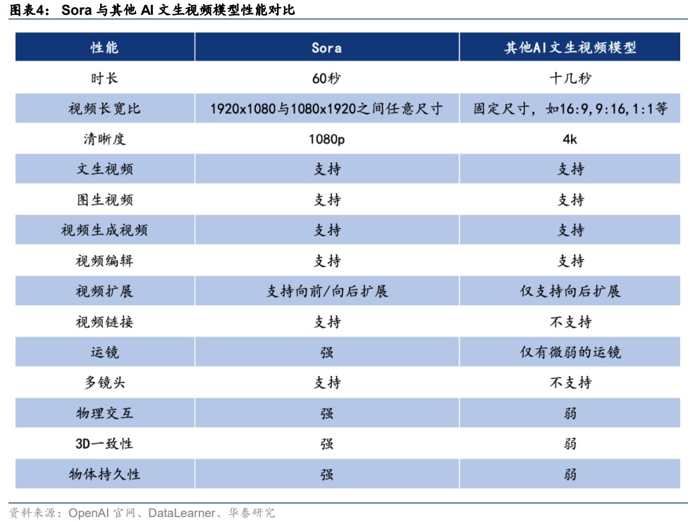然而,OpenAI的Sora直接将这个限制提升至60秒,且与Pika、Runway等之前的AI文生视频工具相比,Sora不仅具有完成视频向前扩展、视频拼接等更加复杂的任务的能力,还能通过多镜头等方式带来更加生动的多视角视频,同时在生成视频的时长、流畅度和逻辑性等方面优势显著。
