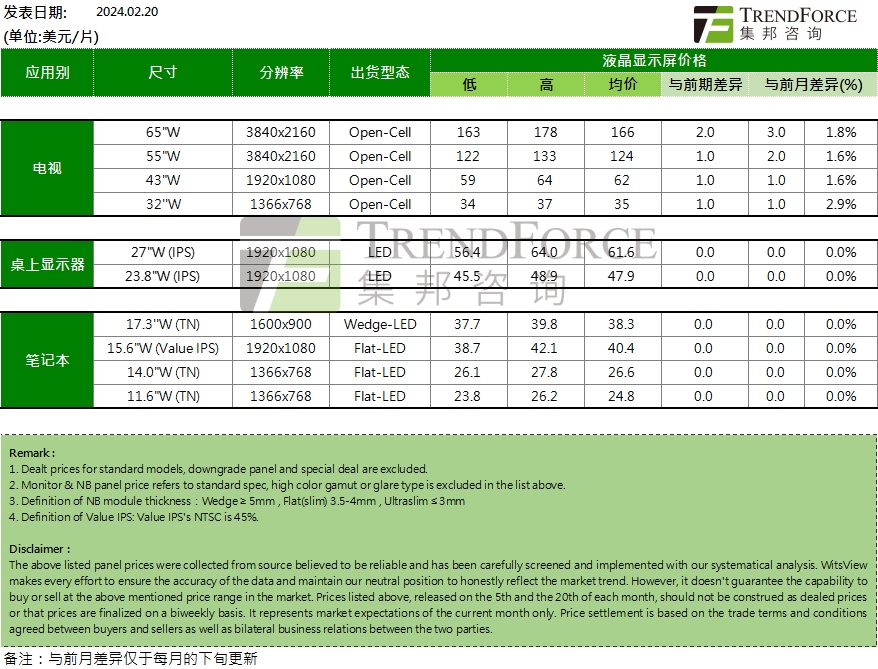 智通财经APP获悉,2月20日,根据TrendForce集邦咨询调研数据,2024年2月下旬,各尺寸电视面板价格上涨,显示器、笔记本面板价格维持不变,具体内容如下: