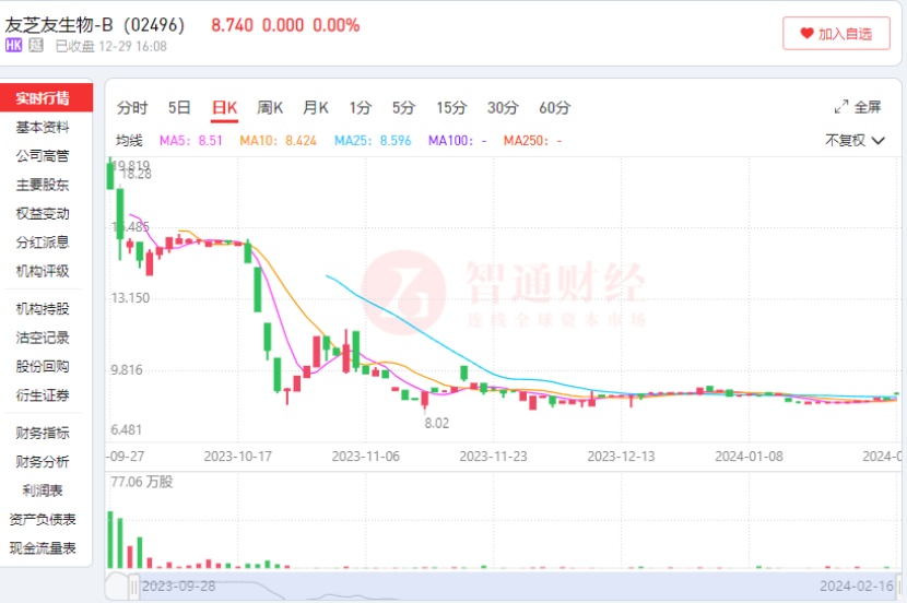 智通财经APP观察到,在去年10月份后,友芝友生物股价迅速跳水,截至今年2月20日,公司股价仅为8.74港元,较发行价跌去45.38%,这显然已经远远低于基石投资者IPO阶段的认购价格。如今,离今年3月24日的上市解禁期仅有一个月时间。