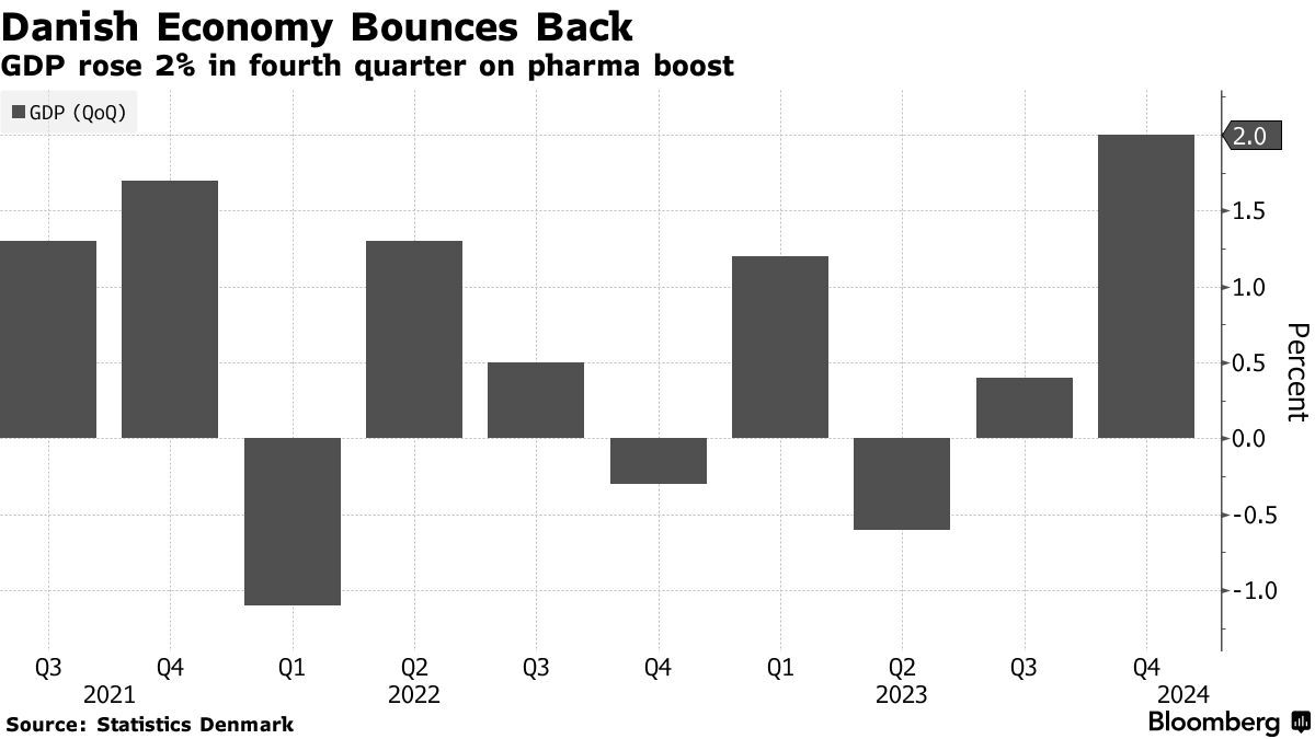 智通财经APP获悉,丹麦统计局周二公布的数据显示,丹麦2023年第四季度国内生产总值(GDP)增长2%。报告指出,制药业是这一扩张背后的推动力,不断增长的私人消费也支持了增长。