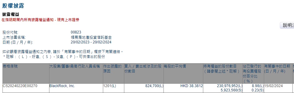 智通财经APP获悉,香港联交所最新资料显示,2月15日,贝莱德减持领展房产基金(00823)82.47万股,每股作价38.3812港元,总金额约为3165.30万港元。减持后最新持股数目约为2.31亿股,最新持股比例为8.98%。