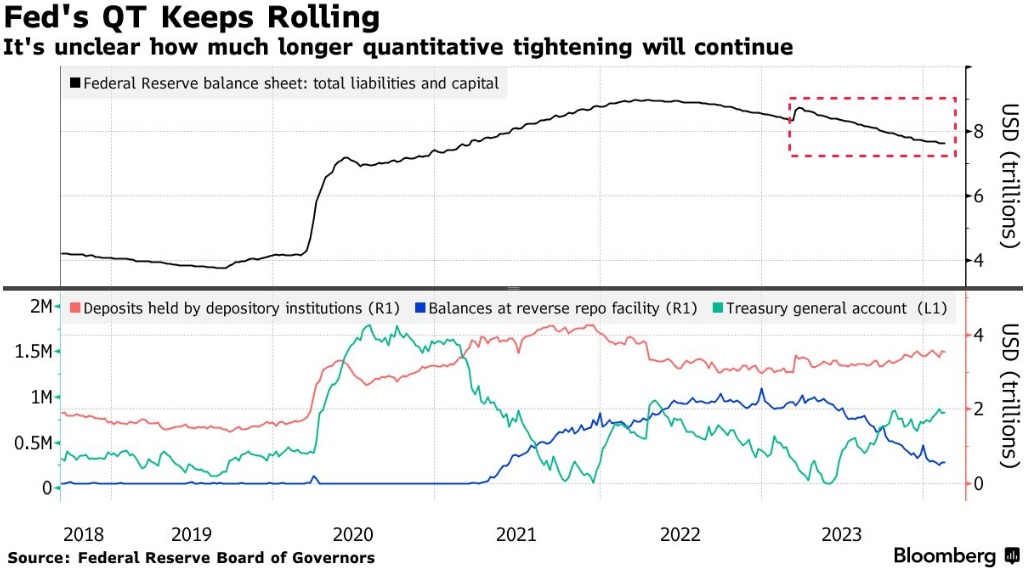 与此同时,根据最新数据,银行准备金余额——央行资产负债表上的另一项重大负债——为3.54万亿美元。这高于美联储2022年6月开始缩减资产时的水平,这一过程被称为量化紧缩(QT)。