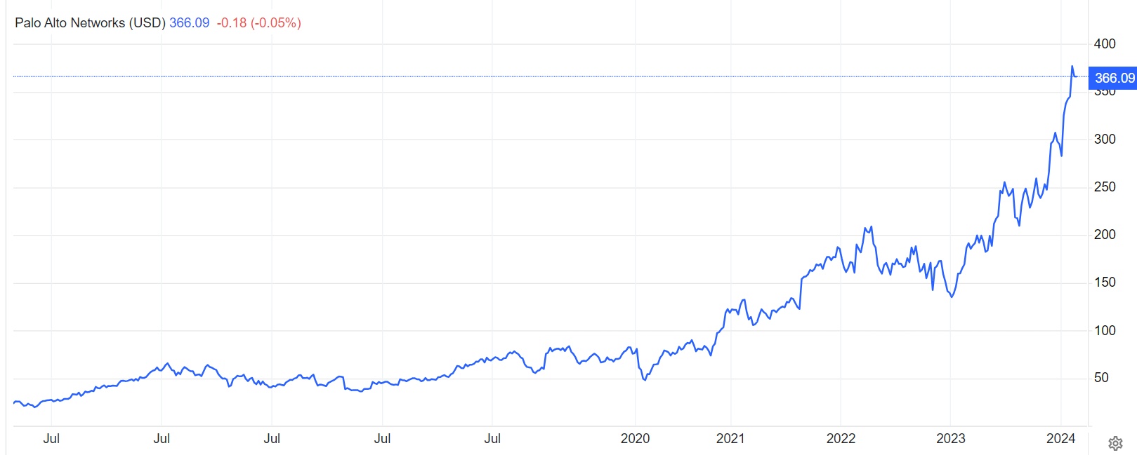 Palo Alto Networks 股价在2024年的强势表现超过了绝大多数热门科技股,比如微软、谷歌、亚马逊和AMD,以及Crowdstrike等网络安全类同行。