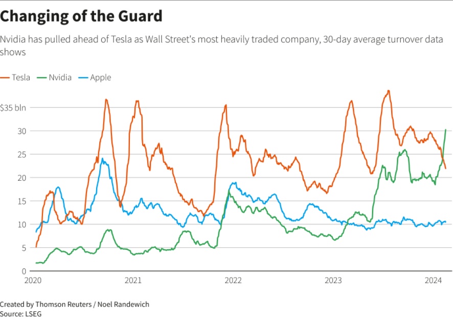 数据显示,在过去的30个交易日里,英伟达股票平均每天成交额约为300亿美元,超过了特斯拉,后者同期平均每天成交额为220亿美元。据了解,自2020年以来,特斯拉一直是美股交易量最大的股票,其每日成交额多次超过350亿美元。相比之下,苹果近日每天成交额约为100亿美元。