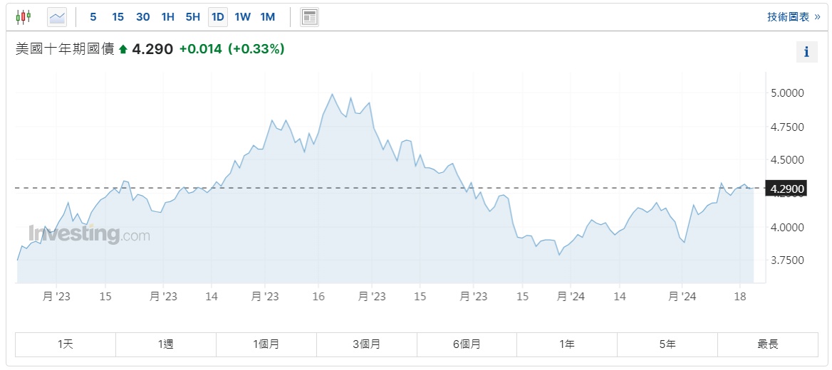 截至发稿,美国10年期国债收益率上涨0.33%,报4.29%。