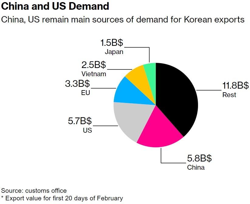 2月份前20天,半导体出口较上年同期增长39.1%,而大多数其他类别的出口则出现下滑,主要原因是工作日减少。数据显示,汽车出口下降23.3%,钢铁产品出口下降16.8%。