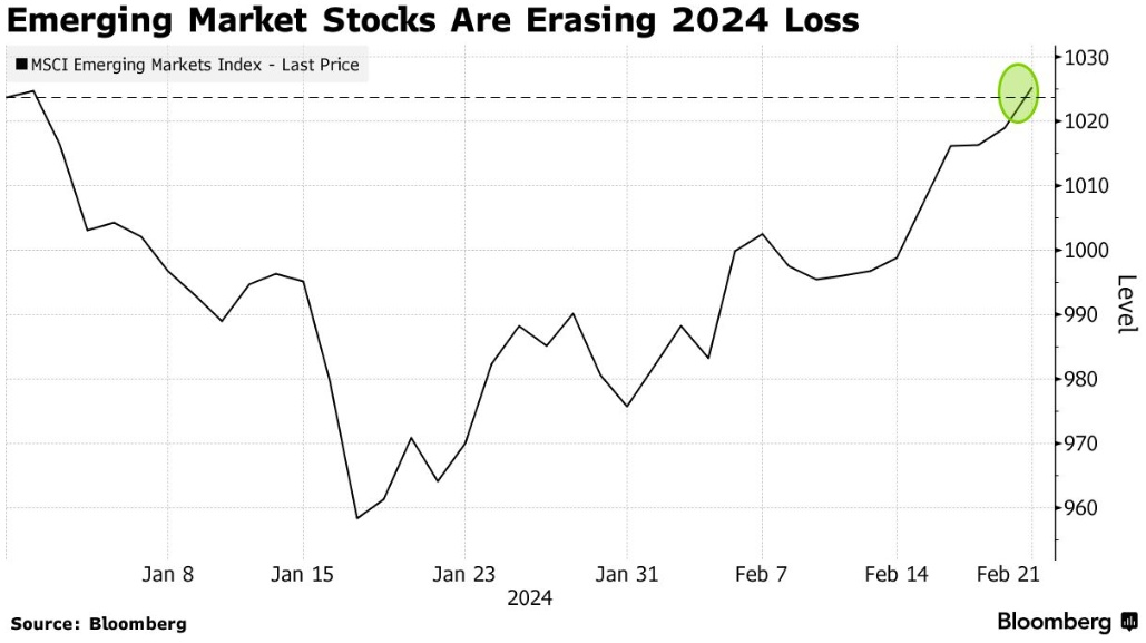 新加坡海峡投资控股公司的基金经理Manish Bhargava表示,“1月份的抛售把新兴市场的估值推到了有吸引力的水平,吸引了逢低买进的人,”他表示,中国经济复苏的迹象——新兴市场增长的关键驱动力——也提振了投资者的信心。