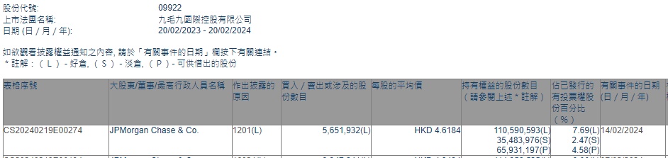 智通财经APP获悉,香港联交所最新资料显示,2月14日,小摩减持九毛九(09922)565.1932万股,每股作价4.6184港元,总金额约为2610.29万港元。减持后最新持股数目约为1.11亿股,最新持股比例为7.69%。