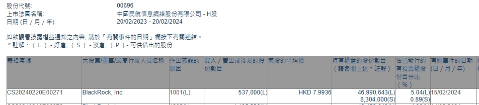 智通财经APP获悉,香港联交所最新资料显示,2月15日,贝莱德增持中国民航信息网络(00696)53.7万股,每股作价7.9936港元,总金额约为429.26万港元。增持后最新持股数目约为4699.06万股,最新持股比例为5.04%。