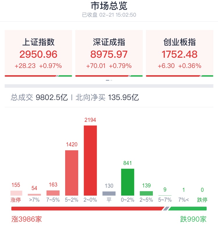 2月21日,A股低开高走,北向资金罕见抢筹超百亿,沪指录得6连阳,盘中一度向上挑战3000点。截至收盘,沪指涨0.97%,报2950.96点;深成指涨0.79%,报8975.97点;创业板指涨0.36%,报1752.48点。