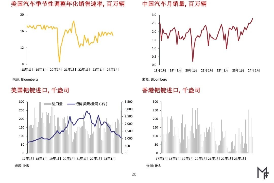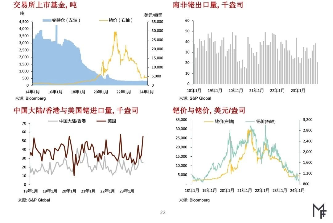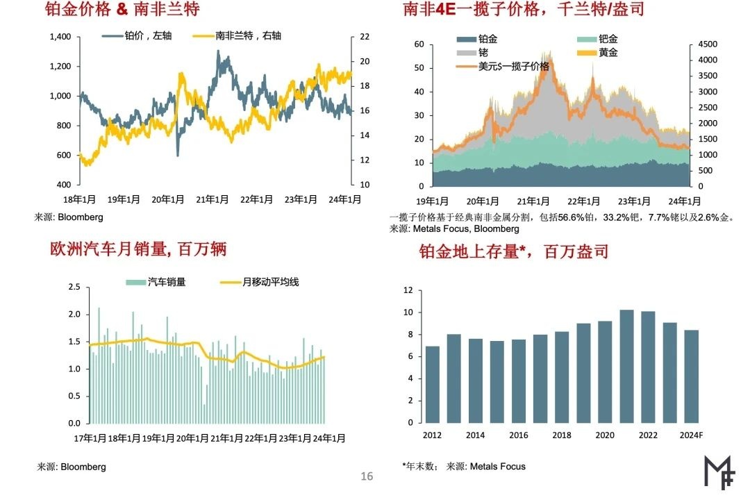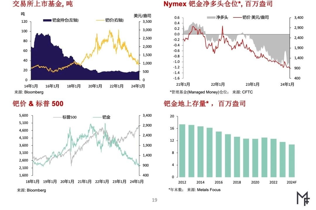 因出现轧空,2023年12月钯金价格曾飙涨30%,触及1,250美元/盎司的高点。但之后钯价连续13天下跌,创逾二十年来最长连跌纪录。因此2024年迄今钯价高点出现于本年首个交易日,为1,117美元/盎司。今天撰写本报告之时,钯价已跌破900美元/盎司,而且更值得关注的是,自2018年以来首次短暂低于铂价。