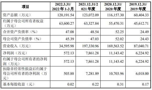 财务方面,博菱电器于2019年、2020年、2021年、2022年1-3月营业收入分别约为8.70亿元、16.96亿元、19.73亿元、3.46亿元,同期净利润分别约为6224.92万元、1.11亿元、7861.28万元、572.13万元。