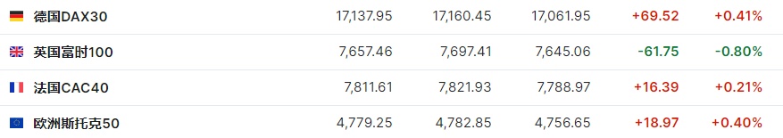 2.截至发稿,德国DAX指数涨0.41%,英国富时100指数跌0.80%,法国CAC40指数涨0.21%,欧洲斯托克50指数涨0.40%。