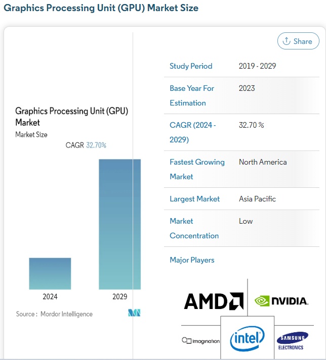 Mordor Intelligence表示,GPU硬件不仅用于渲染图像、动画和电子游戏,还用于一般性的计算目的,几乎部署在全球所有计算型设备中。个人电脑、笔记本电脑和新兴应用(例如 AR/VR、高性能计算、人工智能、机器学习、区块链、加密货币挖掘、自动驾驶和高精度导航(车辆、机器人)的积极部署趋势,尤其是人工智能领域,未来将极大力度推动GPU需求。