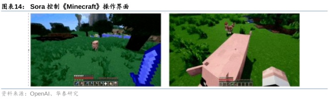 OpenAI也在Sora技术报告中提出,Sora能够模拟视频游戏的数字化过程。根据官方视频演示,Sora能在控制《Minecraft》游戏角色进行基本操作的同一时间高质量动态渲染游戏世界。基于此,Sora未来将可能被应用生成游戏动画和场景等,游戏开发者的成本有望降低。
