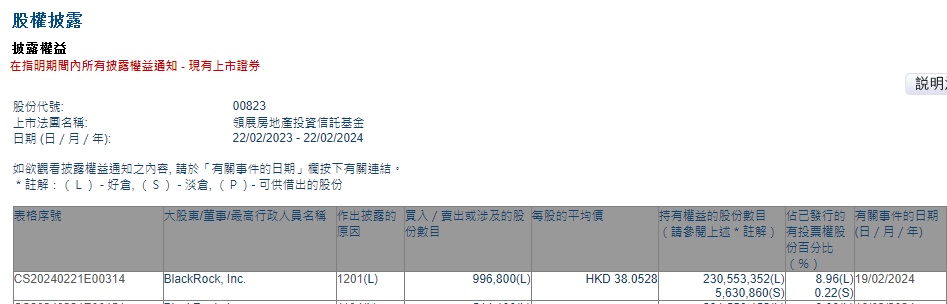 智通财经APP获悉,香港联交所最新资料显示,2月19日,贝莱德减持领展房产基金(00823)99.68万股,每股作价38.0528港元,总金额约为3793.10万港元。减持后最新持股数目约为2.31亿股,最新持股比例为8.96%。