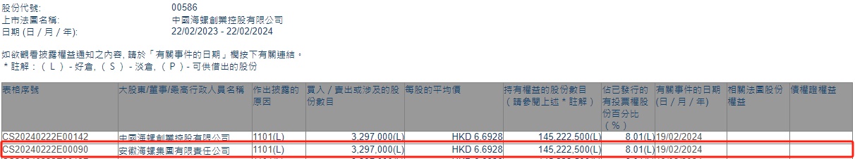 智通财经APP获悉,香港联交所最新资料显示,2月19日,安徽海螺集团增持海螺创业(00586)329.7万股,每股作价6.6928港元,总金额约为2206.62万港元。增持后最新持股数目约为1.45亿股,最新持股比例为8.01%。