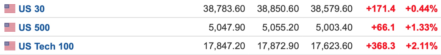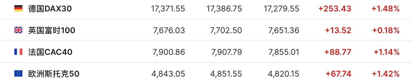 2.截至发稿,德国DAX指数涨1.48%,英国富时100指数涨0.18%,法国CAC40指数涨1.14%,欧洲斯托克50指数涨1.42%。